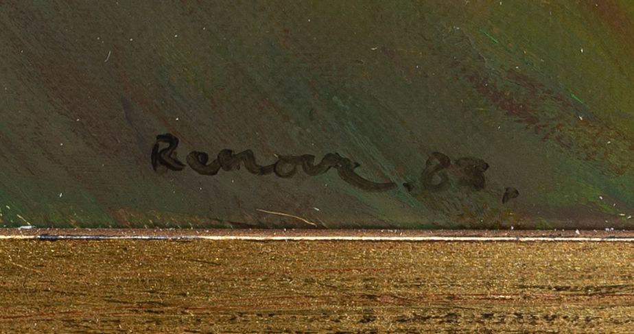 Decorative framed oil on canvas painting, "Danse a la Campagn" (Dance in the Country), after the original by Pierre-Auguste Renoir (France, 1841-1919), facsimile signature lower left, centered in gilt frame, sight: approx 47.5"h, 23.5"w, overall: approx 59"h, 35"w, 18.5lbs **Note: the original painting is currently in the collection of the Musee d'Orsay in Paris**