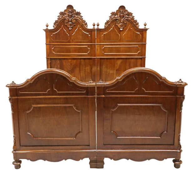 Italian figured walnut bed, late 19th c., having paneled headboard with dual floral crests, flanked by scroll motifs and pointed finials, shaped rails joining conforming baseboard, rising on turned feet, split and fill restoration to right baseboard at lower edge, exterior: approx 77"h, 84"l, 74"w, interior: approx 78"l, 69"w